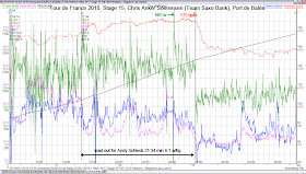 And then finally, it's interesting to look at the data of Chris Anke Sorensen (apologies for all the graphs). Sorensen has been the last Saxo man to peel off before Andy Schleck and the GC riders duke it out, and so his numbers are fascinating because they show you the effort that has produced a thinning out of the peloton. For example, on the Port de Bales during Stage 15, Sorensen rode at the front of the peloton and was responsible for dropping all but 15 riders.